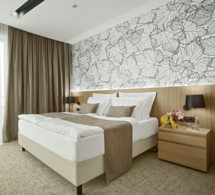 Die Suite Superior bietet ein hohes Maß an Komfort und Privatsphäre. Neben einem Schlafbereich mit großem Doppelbett verfügt die Suite über einen geräumigen Wohnbereich mit einem bequemen Sofa, einem Couchtisch und einer Essecke. Neben einem geräumigen Badezimmer bietet die Suite auch eine zusätzliche separate Toilette. Eine überdachte Terrasse mit Blick auf die nahe gelegenen Weinberge bietet zusätzlichen Raum im Freien. Kostenloses Wi-Fi, kostenlose Nutzung des hoteleigenen Wellnessbereichs und der Saunen stehen den Gästen zur Verfügung. Das Hotel bietet auch kostenloses Parken in der Garage und Ladestationen für Elektroautos. Ein reichhaltiges Frühstücksbuffet ist im Preis inbegriffen und der Zimmerservice ist rund um die Uhr verfügbar.
