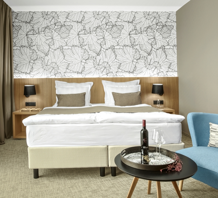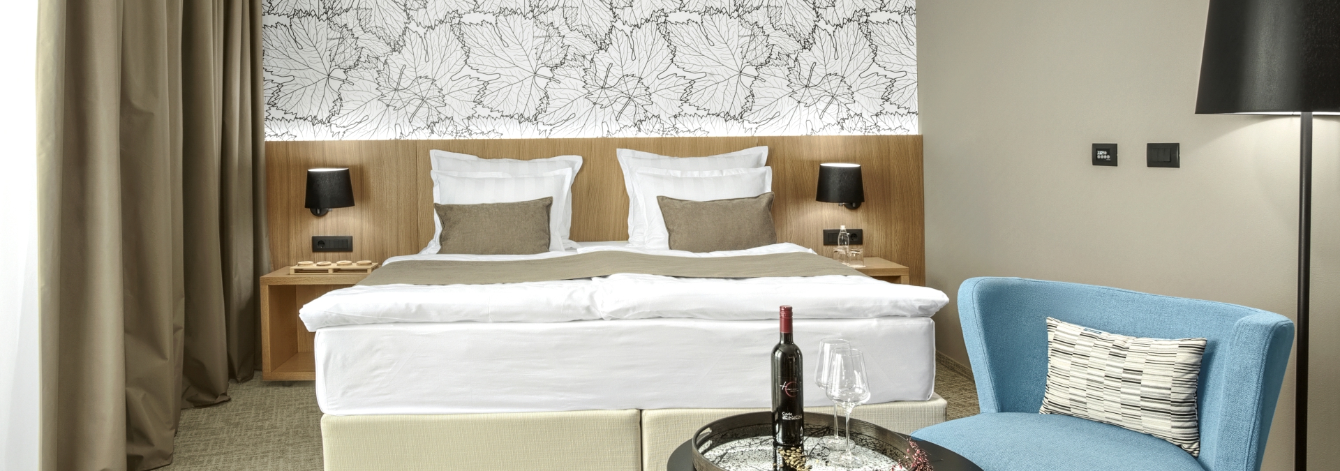 The Superior Room is a comfortable, modernly equipped room with a terrace. It is suitable for up to two guests, with some rooms also offering an additional third bed. It features either a double bed or two separate beds, and the bathroom includes either a shower or a bathtub. Free Wi-Fi, complimentary access to the hotel’s wellness area and saunas are available. The hotel also provides free garage parking and charging stations for electric vehicles. A rich self-service breakfast is included in the price, and room service is available 24 hours a day.