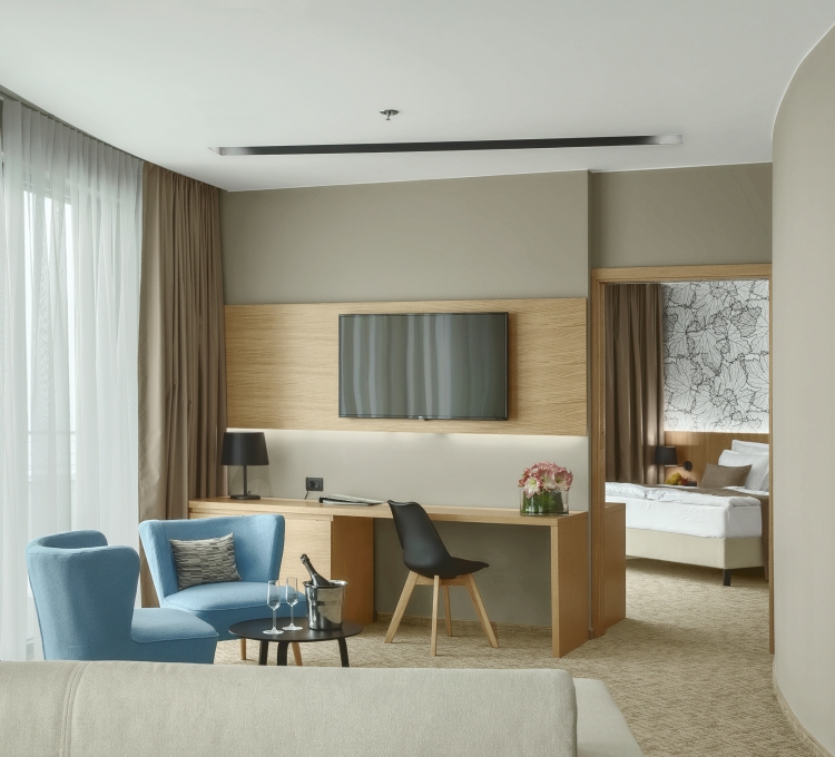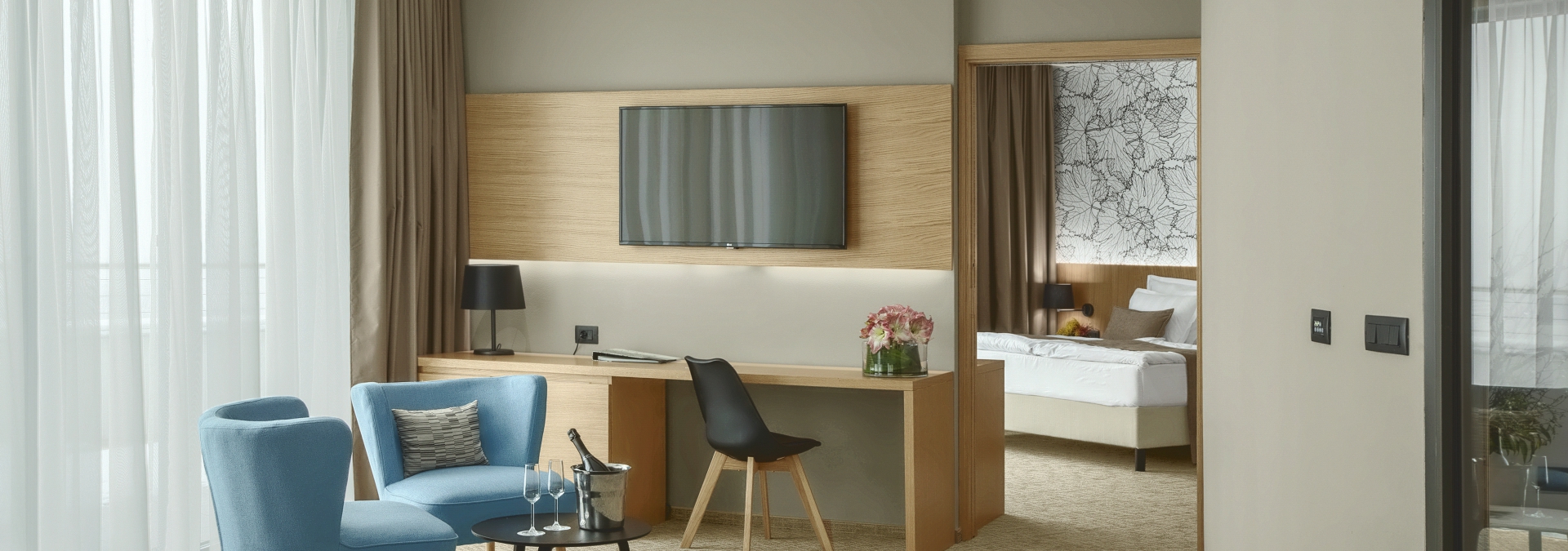 Luksuzna suita Delux vam nudi najvišji nivo udobja. Poleg spalnega dela z veliko zakonsko posteljo ima tudi prostoren bivalni del, v katerem je jedilni kot s kaminom ter udoben kavč in klubska mizica z udobnimi naslonjači. Poleg prostorne kopalnice z luksuzno kopalniško opremo suita nudi tudi dodaten ločen WC. Na voljo vam je brezplačen wi-fi, brezplačna uporaba hotelskega wellnessa in savn. Hotel nudi tudi brezplačno garažno hišo in polnilne postaje za električne avtomobile. V ceno je vključen bogat samopostrežni zajtrk, 24 ur na dan pa vam je na voljo tudi sobna strežba.